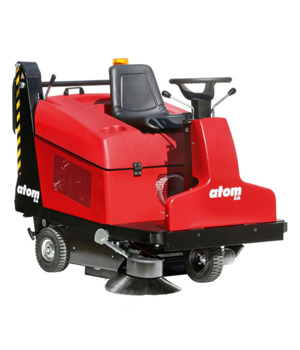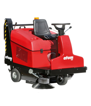 Zamiatarka Atom plus to samojezdne kompaktowe urządzenie z siedzeniem dla operatora, przeznaczone do sprzątania małych i średnich powierzchni wewnętrznych zewnętrznych.